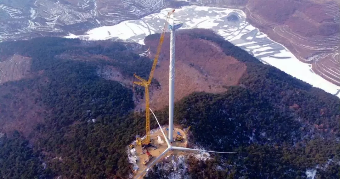2017年河南蘭考某風(fēng)場,徐工1250噸級的XGC16000履帶起重機(jī)將一臺遠(yuǎn)景2.2MW風(fēng)機(jī)機(jī)艙成功吊裝至140米高的塔筒上。