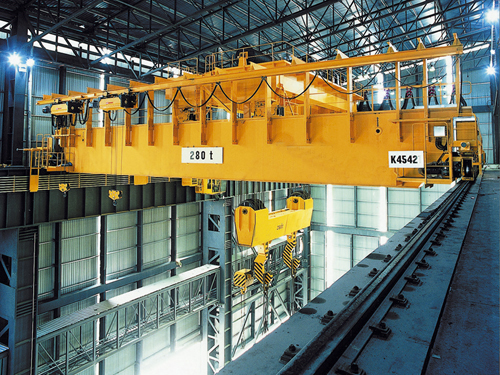 橋式起重機是橫架于車間、倉庫和料場上空進行物料吊運的起重設備。由于它的兩端坐落在高大的水泥柱或者金屬支架上,形狀似橋。橋式起重機的橋架沿鋪設在兩側高架上的軌道縱向運行,可以充分利用橋架下面的空間吊運物料,不受地面設備的阻礙。它是使用范圍**廣、數量**多的一種起重機械